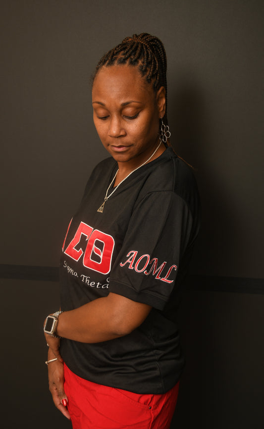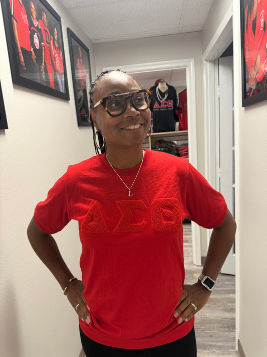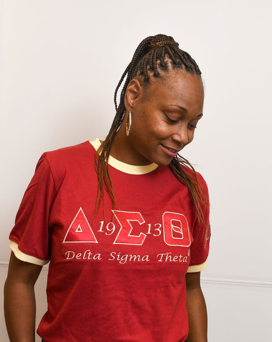 Crimson & Cream Delta Sigma Theta Greek Letters, 1913 Founding Year t-shirt w AOML on sleeve