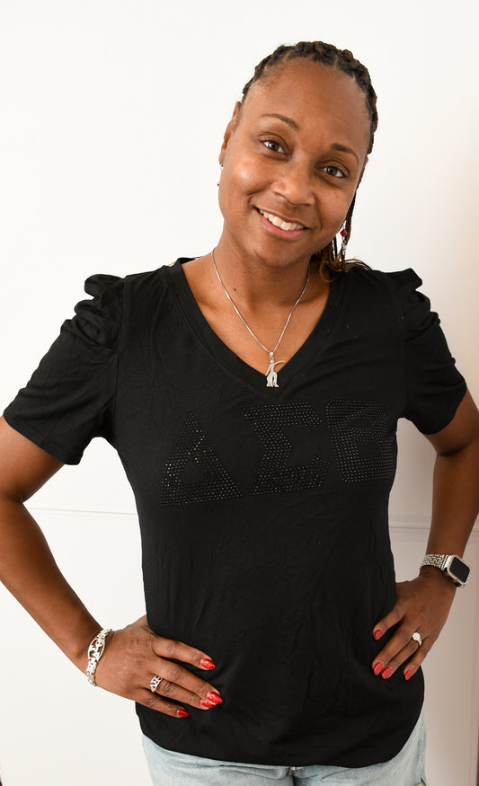 Women's V-Neck Casual Puff Sleeve Black Top with DST Symbol in Black Bling