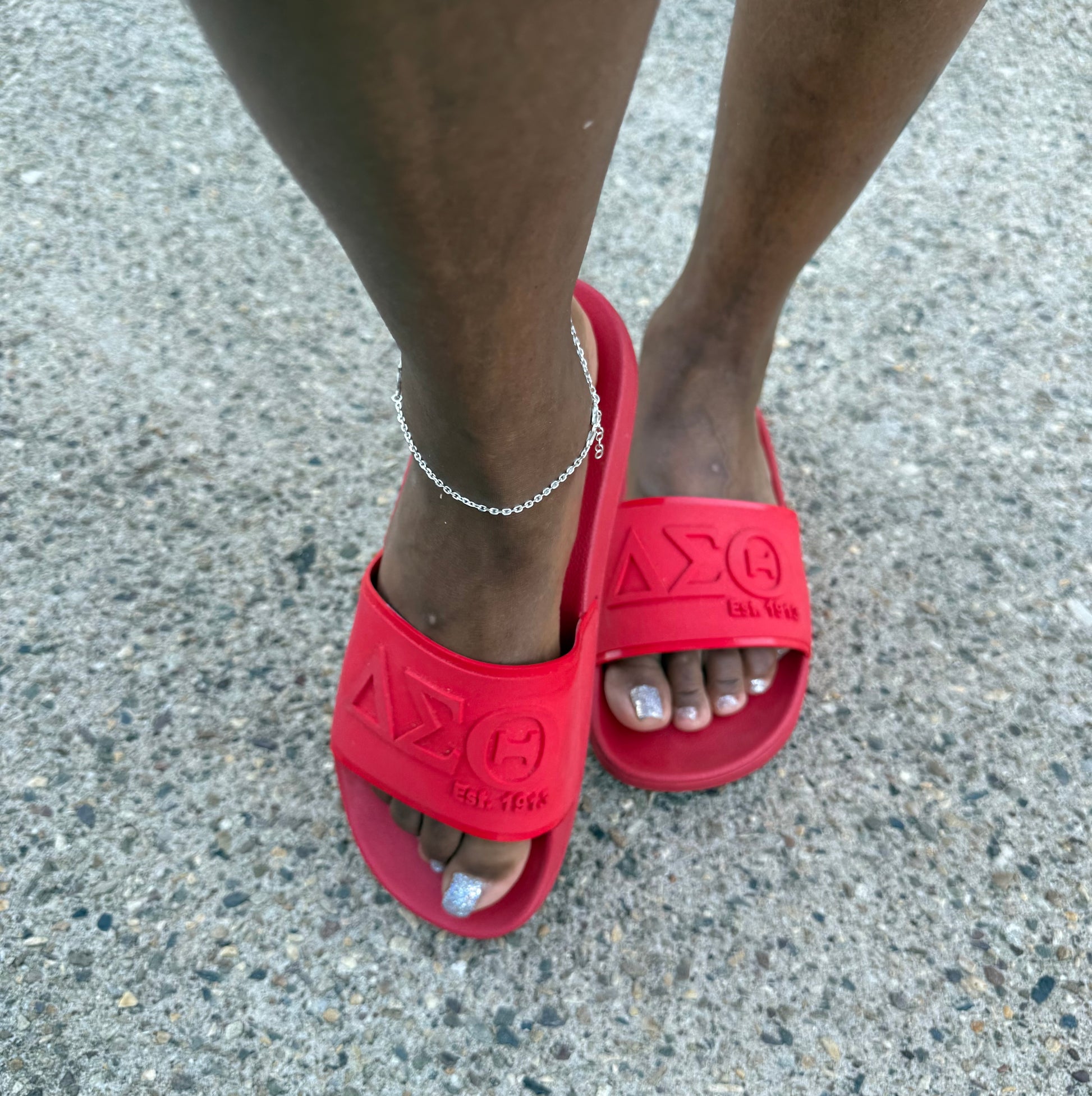 Our DST Slides are back! These slides are Crafted with a sleek black-on-black design, they feature embossed Delta Sigma Theta (DST)symbols, exuding both elegance and history. Show off your Sorority pride and showcase your style with these timeless est. 1913 slides.