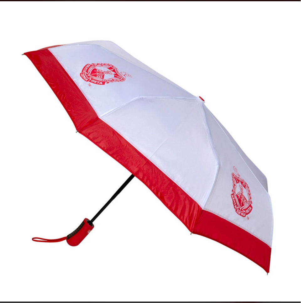 Stay dry even in the rain with this stylish small umbrella from DST! Its red and white design features our Sorority crest, making it the perfect accessory for any stylish Delta. Stay safe and dry with DST's Small Umbrella.