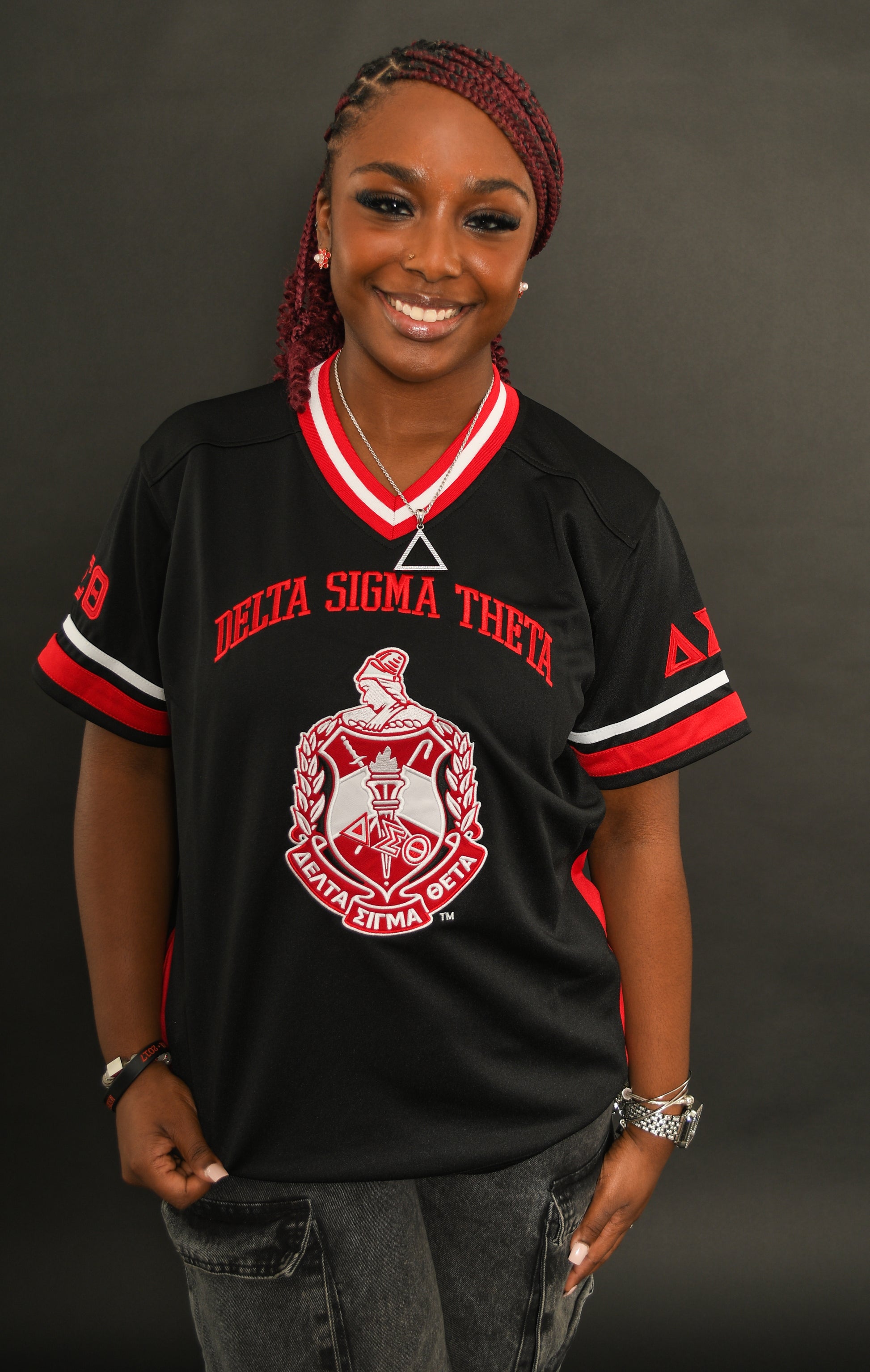 Get ready for game day with our DST Football Jersey! Made with 100% polyester, it is durable and comfortable for all your on-field needs. Available in both red and black, you'll be sure to stand out on the field. Show off your Sorority spirit and dominate the game in style.