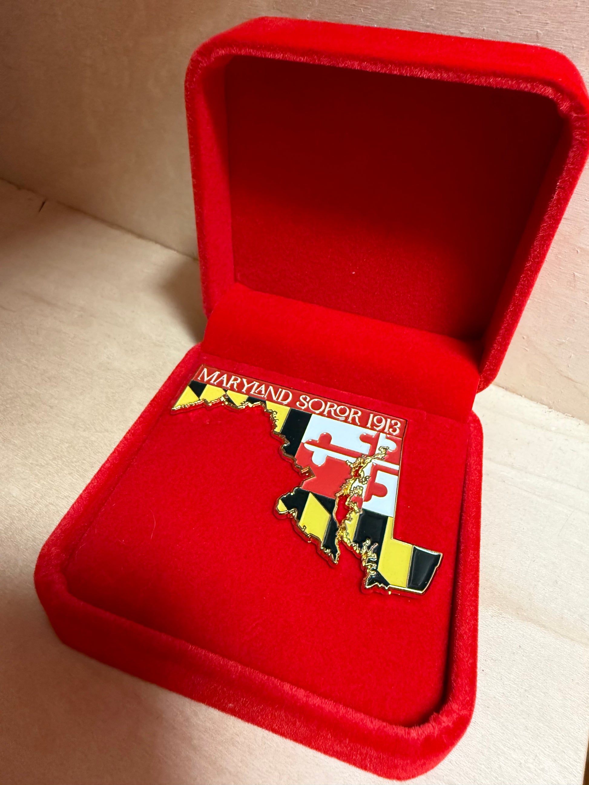Experience the utmost class and refinement with our beautiful 3“ lapel pin, representing your loyalty to Maryland and Delta Sigma Theta Sorority, Inc. The state's iconic flag and delicate engraving of "Maryland Soror 1913" exemplify your membership while elevating any ensemble with an elegant touch. Showcase your distinguished Sorority and State pride with our exclusive lapel pin.