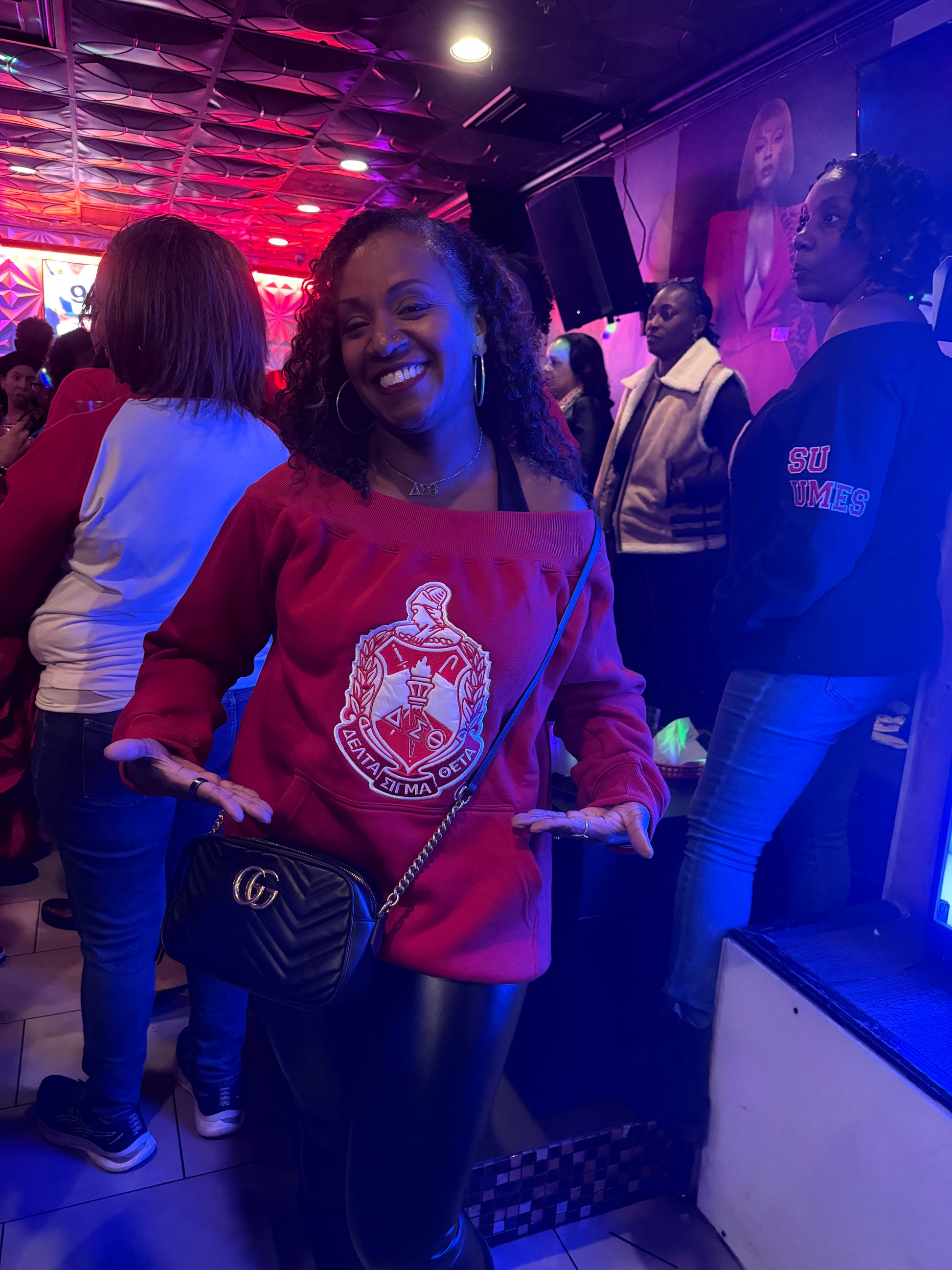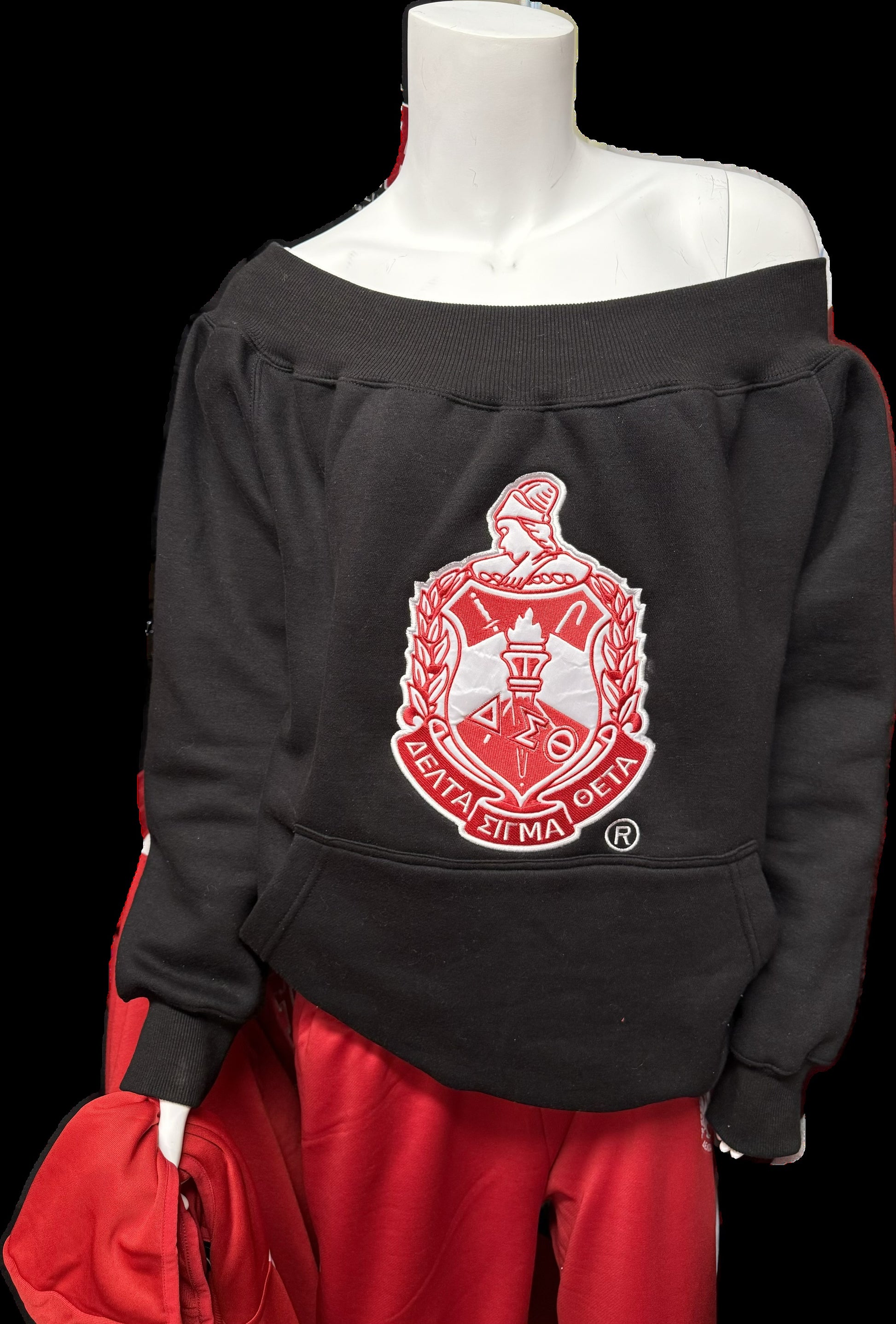 With our exclusive sorority crest and elegant off-the-shoulder design, this top will elevate your style to new heights. Perfectly combining fashion and functionality, it even features convenient pockets. Make a statement in sophistication with a choice of red or black.