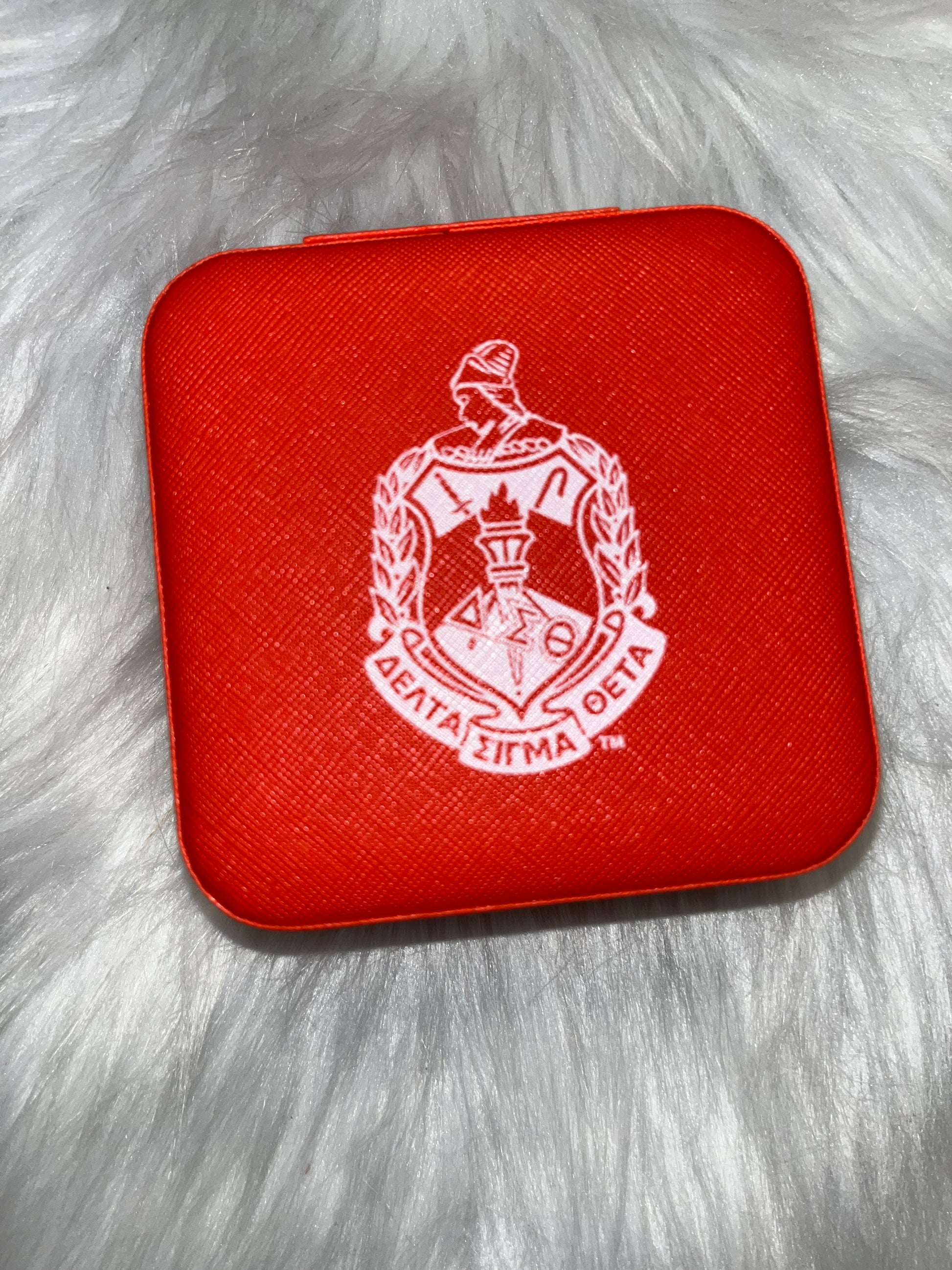 This portable Red PU Leather DST W / Sorority Crest Small Travel Jewelry Box is perfect for traveling Delta Women. With a compact mirror for touch-ups on the go, it's both functional and stylish. Keep your jewelry safe and secure while exuding elegance and sophistication with this must-have accessory.